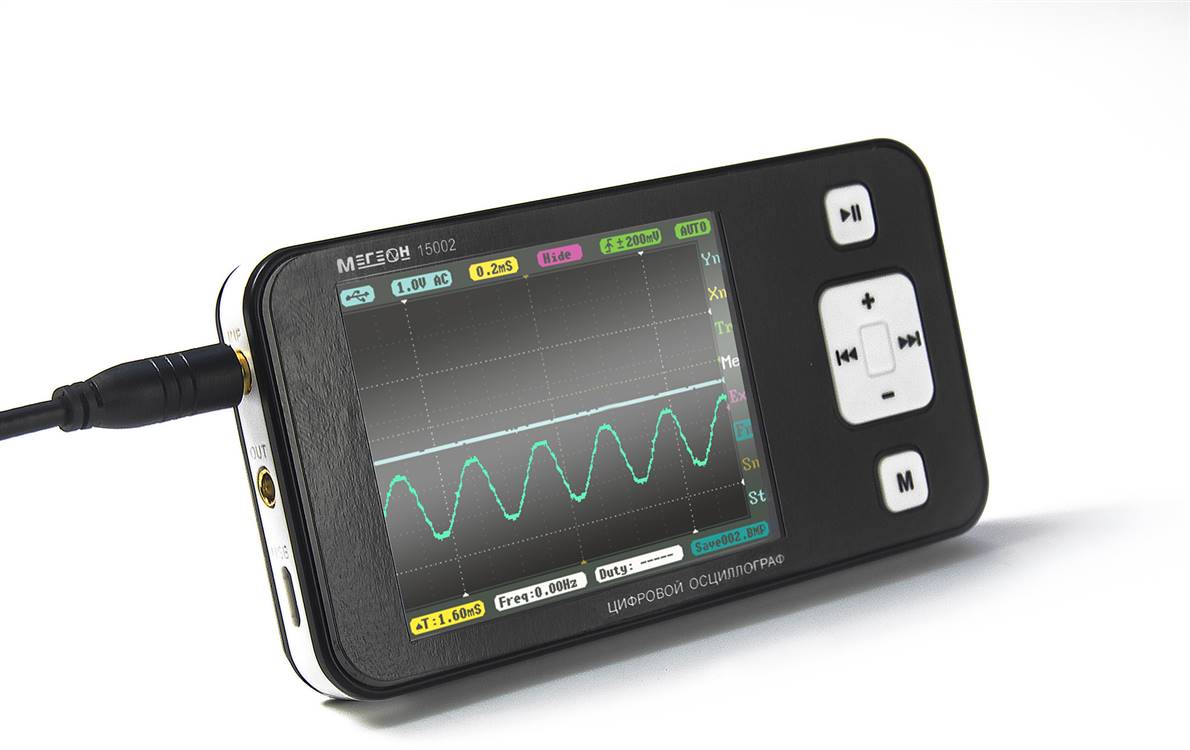 Одноканальный компактный цифровой осциллограф МЕГЕОН 15002 на базе 32-битной платформы ARM Cortex-M3 со встроенным генератором сигналов. Прибор оснащен цветным дисплеем 320х240 пикселей, встроенной памятью и USB портом для хранения данных и передачи их на ПК.