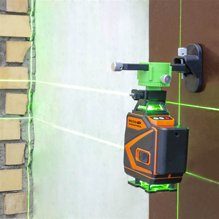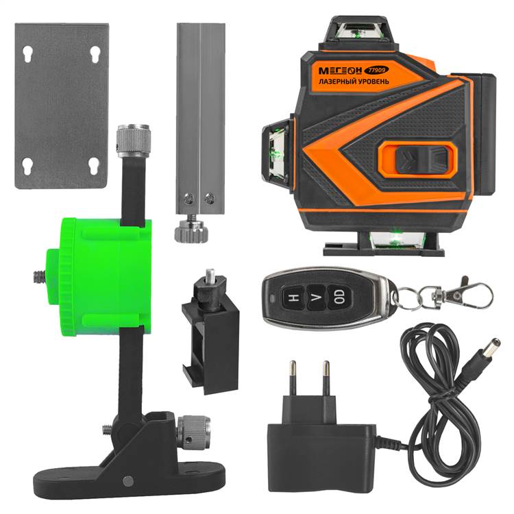 МЕГЕОН 77909 - четырёхмерный лазерный уровень с шестнадцатью яркими зелёными лучами и механизмом самовыравнивания.